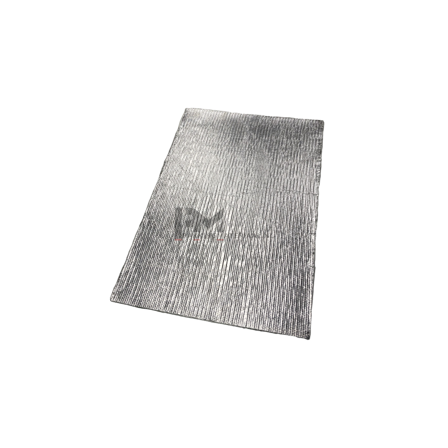 Hitteschild gemaakt van glasvezels van het type 'E' (vezels van 9 µm) met een blad van aluminium aan één zijde, en een kleefzijde met een hoge kleefkracht en thermische weerstand aan de andere zijde (HT verwijst naar de kwaliteit van de lijm)